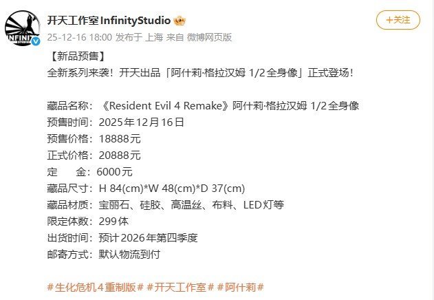 由开天工作室出品的《生化危机4:重制版》艾什莉·格雷厄姆1:2比例限定雕像现已开启预售,定价20888元(预售价格18888元)。本作高度约为84厘米,全球限量发行299体。