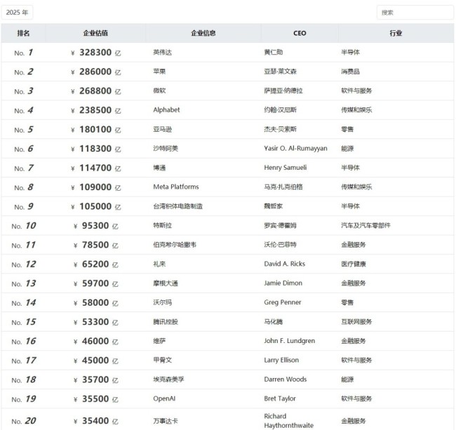 榜单显示,得益于人工智能芯片和数据中心计算需求的激增,英伟达超越微软和苹果,成为全球价值最高的公司,价值32.83万亿元人民币,增长49%。