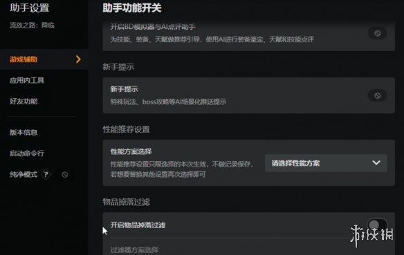 3、在游戏辅助页面往下拉,然后可以看到物品掉落过滤。