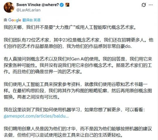 为平息争议,Swen通过IGN发表正式声明强调:拉瑞安不会用AI替代任何开发人员,也不会发布包含AI生成内容的游戏。他在声明中指出:
