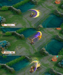 普通攻击方面,每次挥剑都会伴随金紫色剑气拖尾,视觉连贯性极佳。一技能释放时角色跳跃三次,全程附带金紫色光效,动作流畅且富有节奏感。二技能则在原有基础上扩大了攻击范围,并加入独特的光影表现,使整体战斗体验更加炫酷。