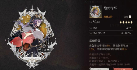 对于锤斧系角色克拉拉而言,绝死行军几乎是必备的武魂选择它,不仅提供了高额的暴击率以强化输出,其附加的额外削韧效果也能有效提升控场能力。