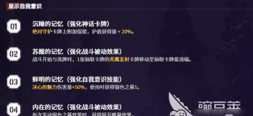 词条优先级方面,建议以防御力(固定值)为首,其次为暴击率、防御百分比、爆伤,最后才是攻击力。由于卡利佩的技能机制主要依赖防御属性来提升伤害和护盾量,攻击属性带来的提升较为有限,因此不建议刻意堆叠700点攻击力以满足潜能需求。卡组优化方面,可优先删除“按边打”和“基础盾”,若队伍中包含较多两费以上的卡牌,则“闪”也可考虑移除;若两费卡较少,则保留“灵光一闪”更为稳妥。核心构筑应围绕“脆弱”与“天上”两个关键词展开。“灵光一闪”优先选取带脆弱词条的牌,其次是天上效果;“重新集结”的选择上,推荐第一类为具备大量两费卡且拥有天上词条的角色,例如小春、凯龙,这类组合可在不额外消耗行动点的情况下完成牌库压缩与定向过牌。
