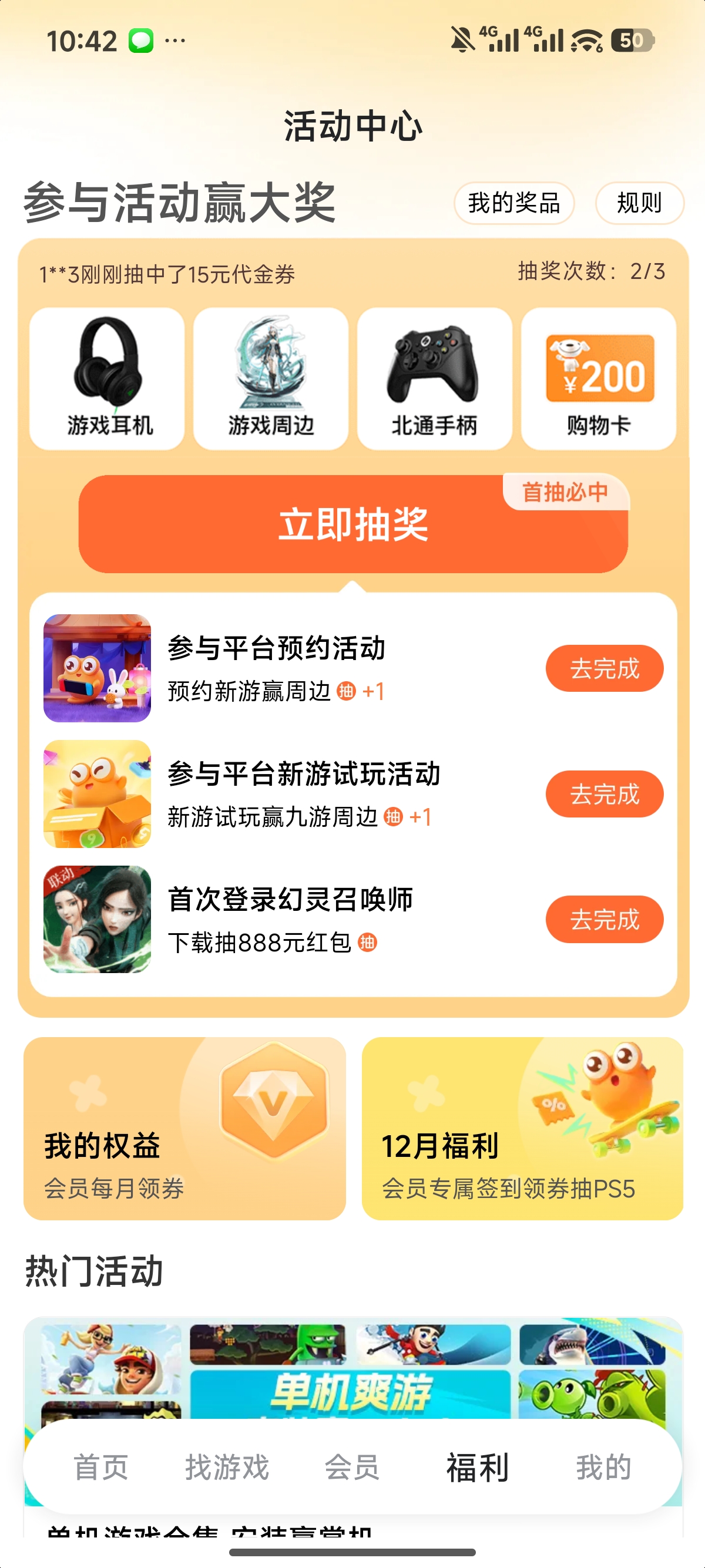 在福利体系方面,平台定期上线签到、任务挑战、限时抽奖等互动活动,参与即可获得包括实体奖品在内的多重回馈——如商超购物卡、蓝牙耳机、游戏手柄等高实用性物品,切实提升日常游戏体验的便利性与沉浸感。
