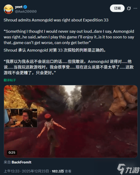 知名《绝地求生》主播、前CS:GO职业战队Cloud9的明星选手“大魔王”Shroud,近期对年度热门游戏《光与影:33号远征队》的态度发生了戏剧性转变。