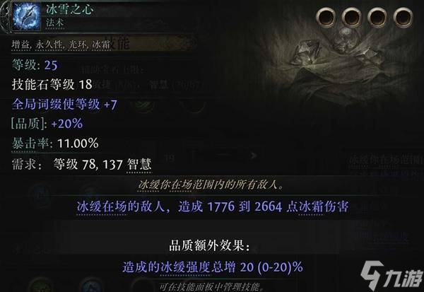 这件装备给我们提供了法术技能等级加成、法术伤害加成、元素曝露、一个光环技能、一个主动技能。其中最重要的是这个光环技能:冰雪之心
