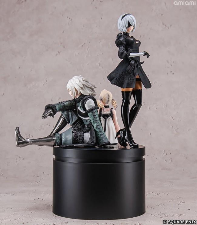 该手办的圆形底座上屹立着系列的核心主角:《尼尔:机械纪元》的人造人2B与《尼尔:人工生命》中的兄妹。雕塑高度约21厘米,其设计延续了横尾太郎作品中特有的黑暗美学风格。