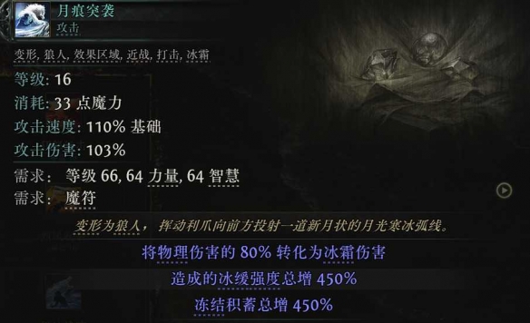 2. 月痕突袭打出冻结接狼爪撕裂,狼爪撕裂攻击冰冻的敌人,每次击中会生成冰霜碎片,延迟后爆炸。