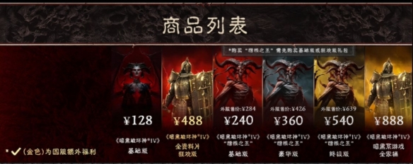 例如,已购买128元基础版的玩家可直接补差价升级至488元狂欢版,在488元基础上再加300元,即可升级为不含《暗黑破坏神2:重制版》与《暗黑破坏神3:夺魂之镰》的DLC终极版。
