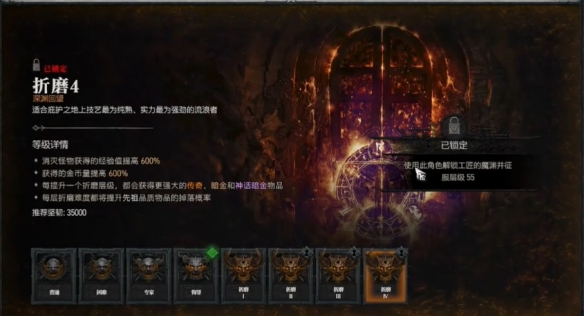 完成熔炉魔窟”副本后,按提示将世界难度改为悔罪”并通关地狱深渊”。之后在赛瑞加左上方找到工匠方尖碑,进入痛苦魔渊”并将层级改为10,通关后即解锁折磨1难度。反复通关更高层级可依次解锁后续折磨难度。