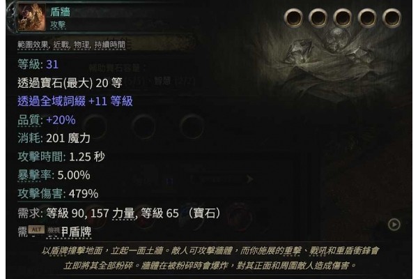 第二部分我们来简要说一下盾墙这个技能,他的基础形态是面前放一个弧形,释放战吼或者重击技能会对其进行引爆,他的伤害取决于盾牌的护甲值以及技能等级带来的固定点伤,和我们的主手武器伤害及攻速完全无关。