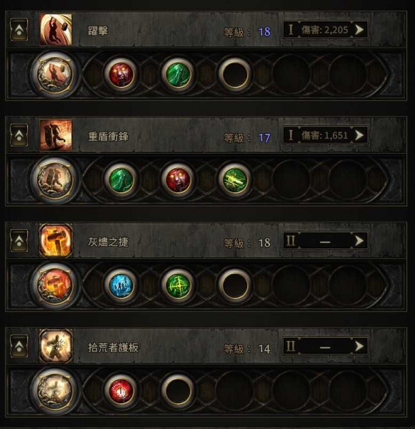 盾墙的辅助我们放疾速攻击2,沉重灰机,野性残暴,另外两个位置,攻坚的话,我们可以放近身战、分量、集中光环三选二,刷图的话,我们可以使用安的城塞和冈姆的疯狂,这两个辅助可以解锁盾墙的刷图牛逼形态,0.4这赛季当中安的城塞不再减少伤害了,属于是对我们这个bd的巨量提升。