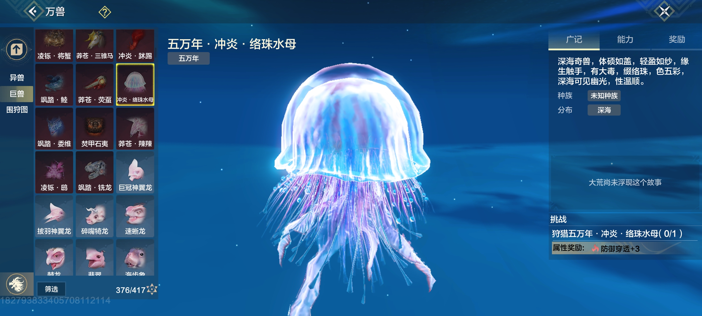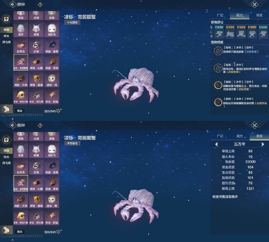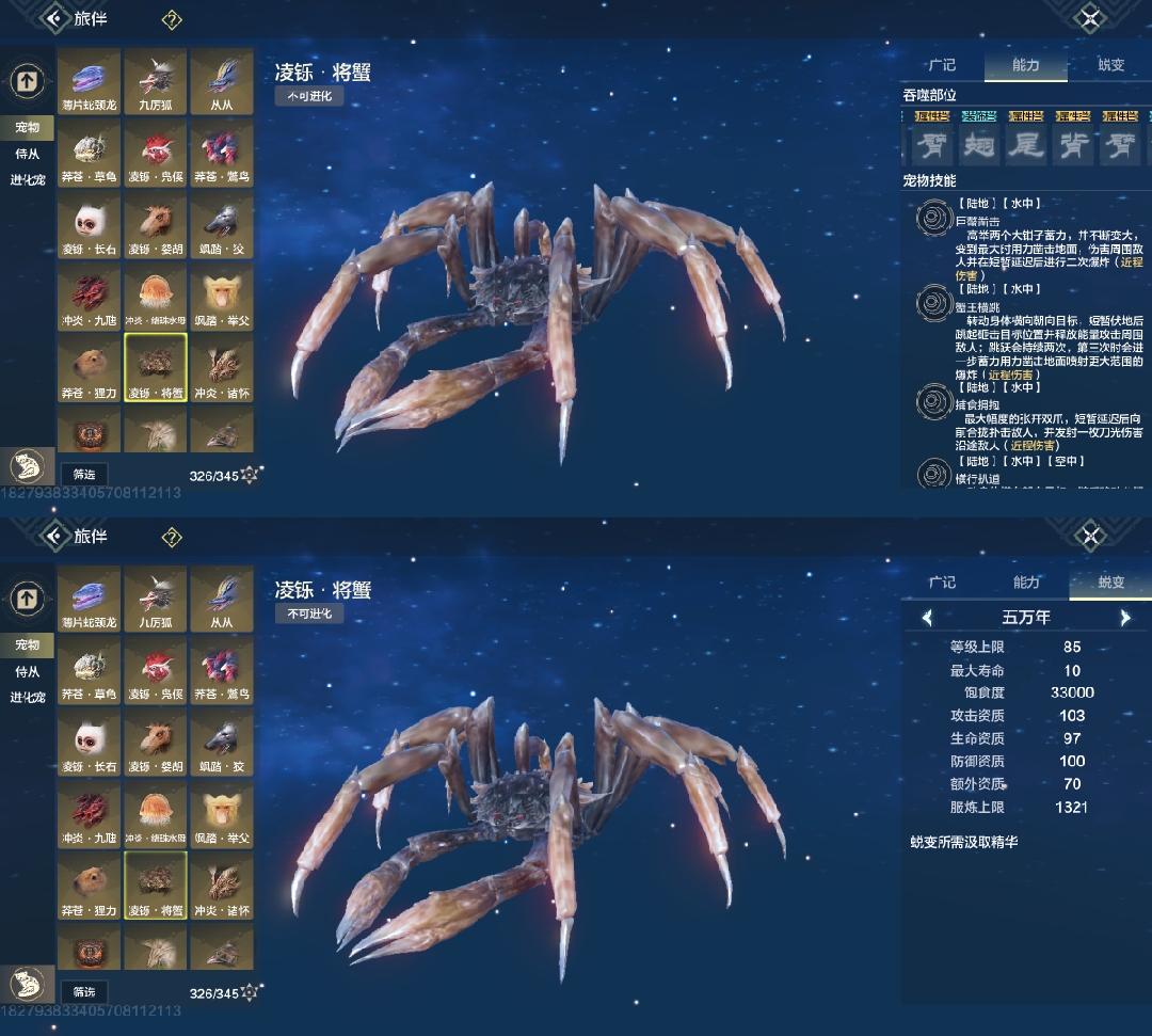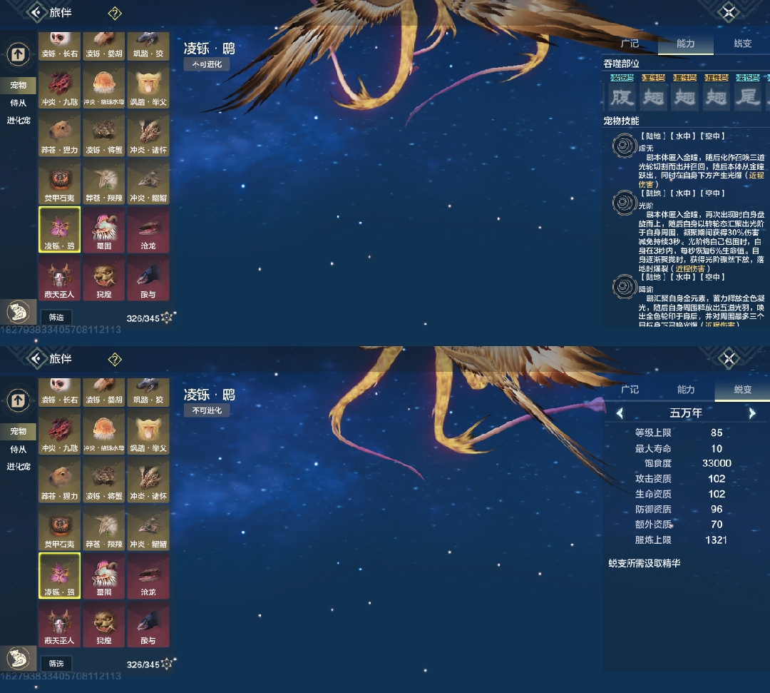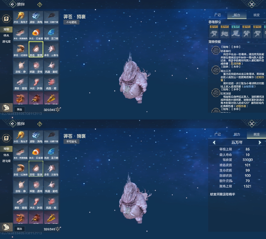 四穿透部位,99攻击资质,悬浮无限魂技宠物,要搞偏转先搞水母,但没幼年,最低年份只有千年,高偏转比较看缘分(偏转必养)