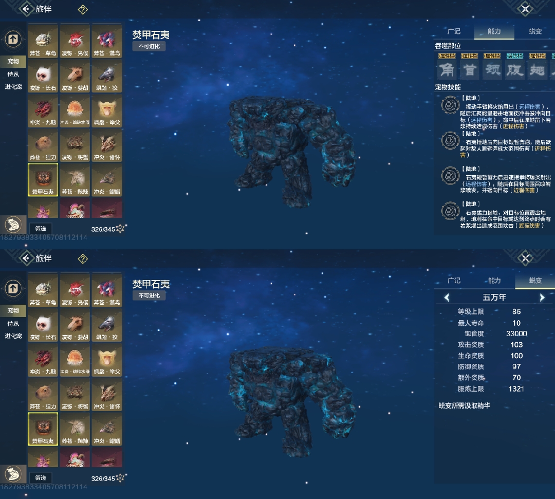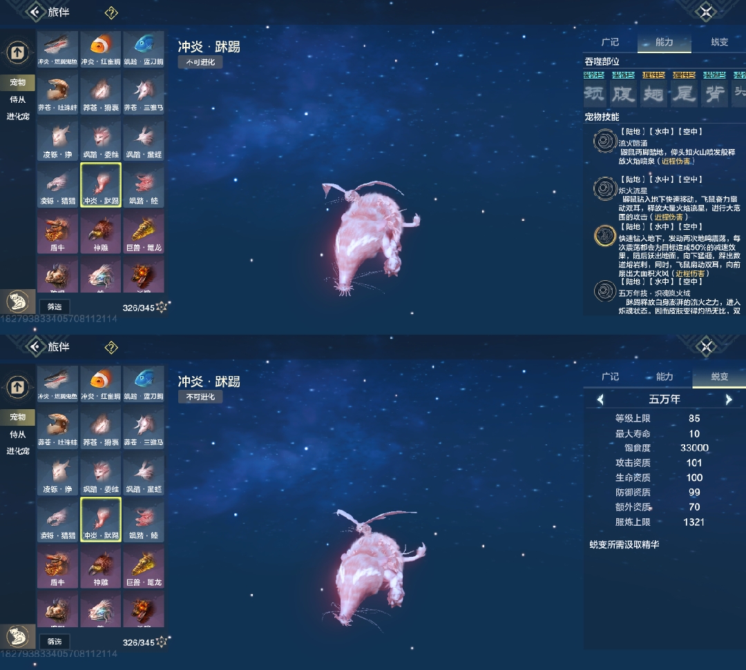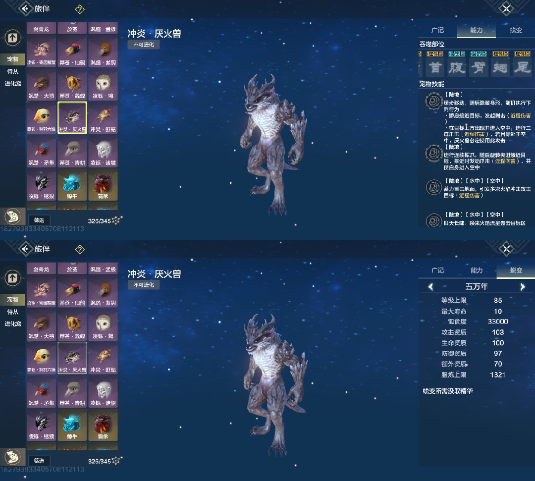 斗兽t1,四穿透部位,三尾巴一翅膀部位,吞噬变异部位最便宜的一只进化宠,养成成本大缩减,互动吞噬青木灵蕴短暂提高对应属性,2000元素穿透也未尝不可(必养)