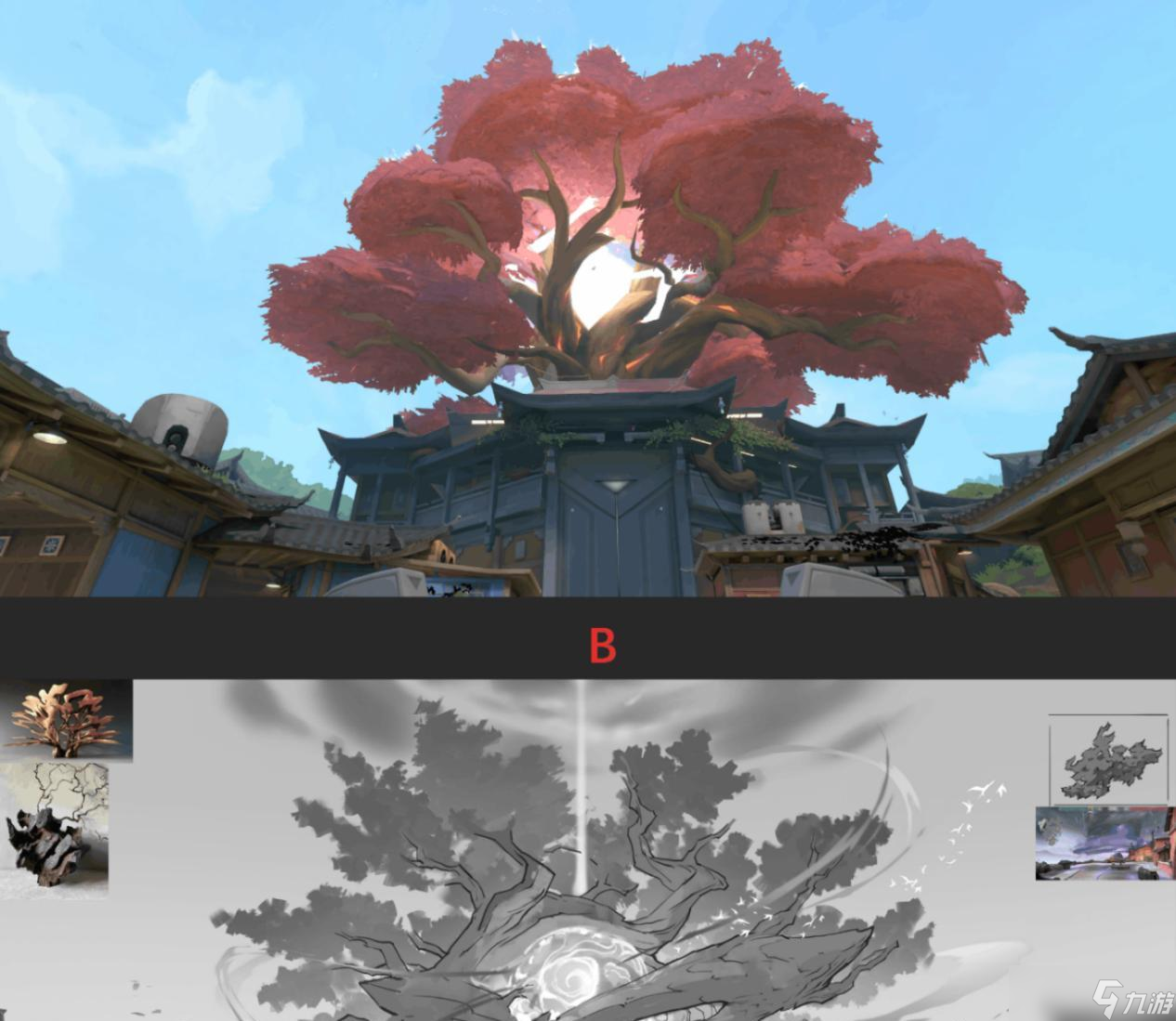 以瓦手独有的国风地图“古寨”为例,攻方和守方被设计师用冷暖色调的方式区分开来,攻守两边的墙壁绘画也有所不同。