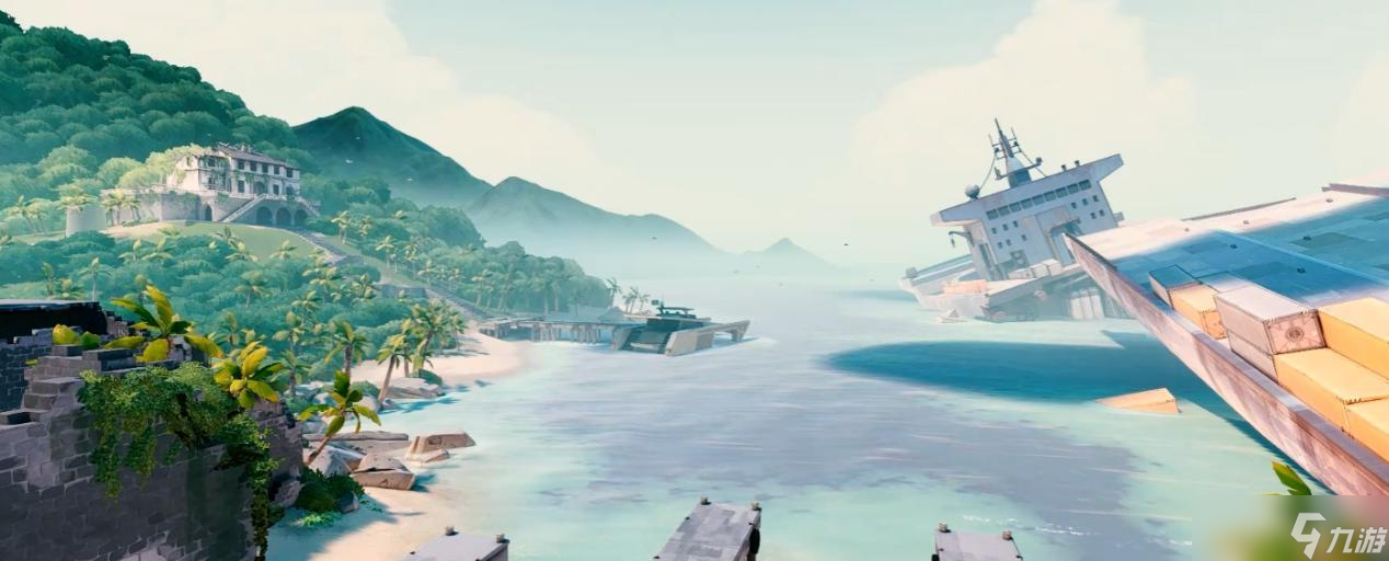 除了角色设计之外,游戏中的地图同样花费了设计师许多心血。我们上面提到,为了竞技性考虑,瓦手地图的主体部分必须保持简洁。而那些地图不可互动的部分,就是设计师展示业务能力的时候了。微风岛屿里阳光穿过棕榈叶的海岛风光、亚海悬城里整座城市漂浮在空中的视觉奇景、霓虹町高低错落的城市设计,都在游戏里恰如其分地呈现了出来。