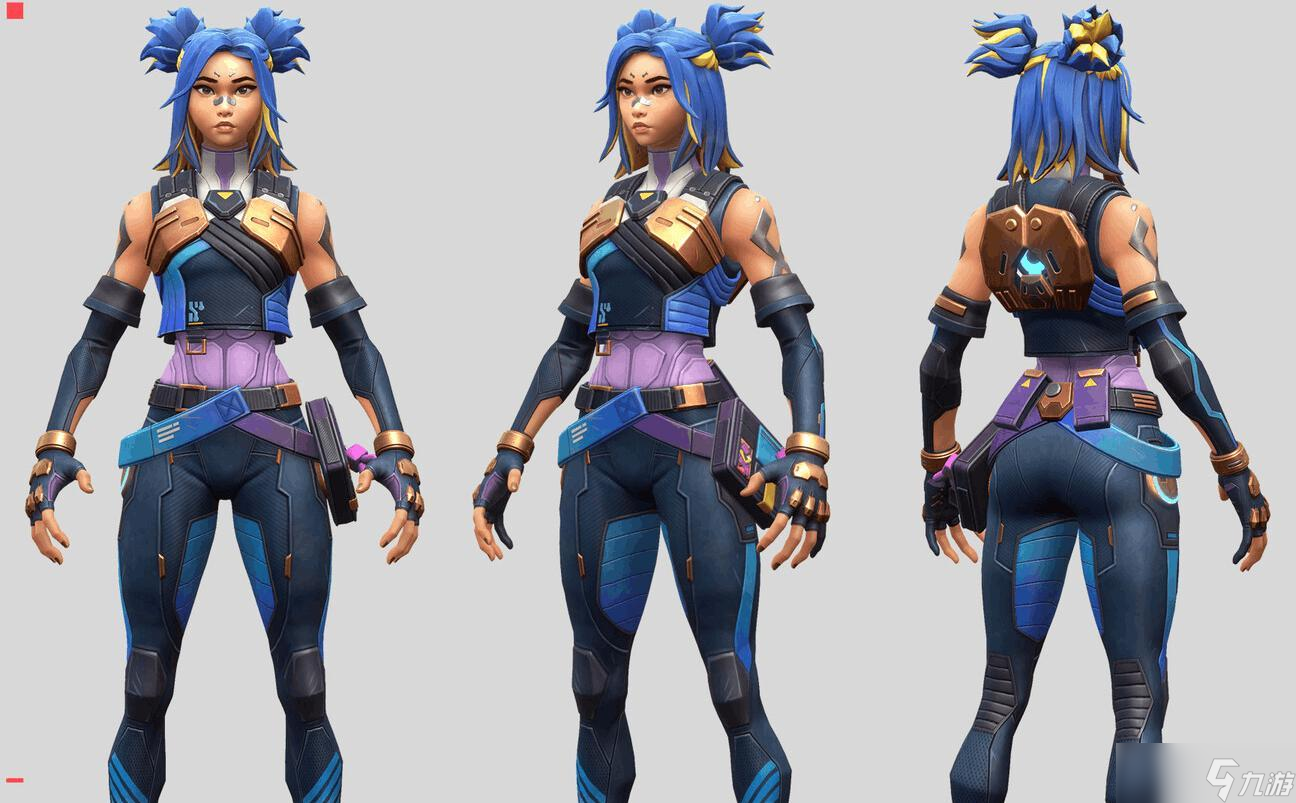 游戏中的英雄设计同样遵循了“为玩法服务”这一理念。每个角色有且只有一两种主题色,在这个基础上,人物的服装、技能、饰品等元素都会紧紧扣着主题色来设计。例如,霓虹的主题色是深蓝,斯凯是草绿,奇乐则是黄色和绿色混搭。这种设计既强化了角色形象,也增加了对局便利度。玩家可以用分辨颜色这种简单有效的方式区分不同的英雄,剔除对局中不必要的干扰。