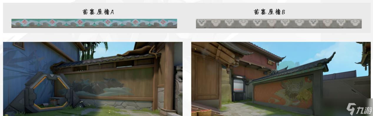 为了保持色调的一致性,不让地图元素干扰正常的游戏进程,设计师组还对取材地的屋檐样式进行了化用,舍弃看起来有些突兀的白色,选用和地图整体风格契合度较高的绿色。