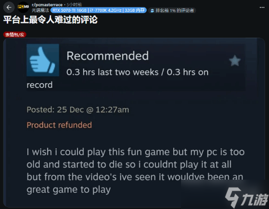 据悉,该玩家已申请退款。短短几行字,令不少玩家感同身受,有人评价这是Steam“最令人心碎的评论之一”。