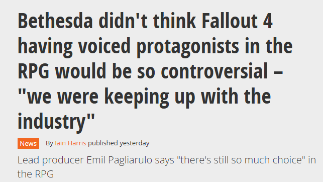 ·在2015年时,带有配音的游戏主角实际上在业界很普遍,只是《辐射4》也是跟风追随时代潮流而已,没想到引发众多玩家的争议。