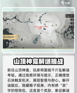 2.第一个钱袋位于山顶神龛处,这里有一个千斤坠解谜考验。玩家需要仔细观察环境,按照正确的逻辑摆放石块来触发机关。解开谜题后会出现一个隐藏宝箱,里面就是绣着“祟”字的钱袋。