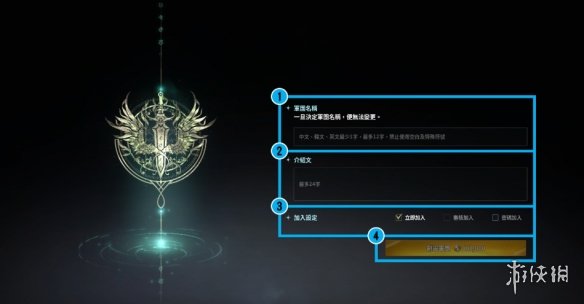 2、点击创建军团,跳转到创建页面,需要输入军团名称和介绍文,将加入条件设置后点击创建即可。