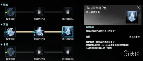 2、首先将宝石专业技能的宝石鉴定师点处来,可以点击右上角页面的精华萃取进入技能页面。