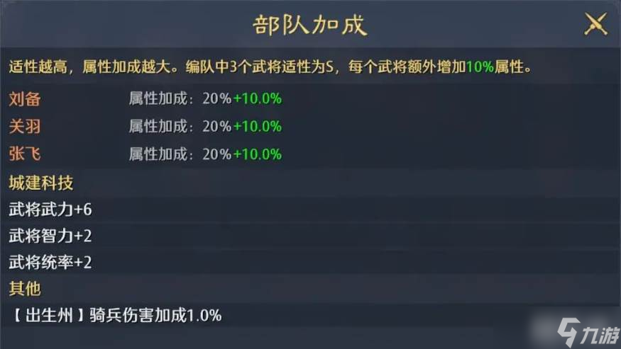 那么武将效果当中,大家还要注意想要同阵营阵容的话,这里得到的10%属性提升会给大家带来更强大的加成,所以前期要兼顾好兵将的品种选择,这里尽量是走同兵种,达到3S阵容就可以达到最大化的属性收益效果,这里根据部队加成,他们带来的属性加成效果当中,适配性越高属性加成就越大,只有3个武将的适配性为S,每一个武将都会额外增加10%的属性,然后根据出生之后带来的伤害加成,就会有更高的百分比提升,而武将进阶在这里根据红度来进行分配的话,会有5个档次。