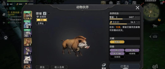 接下来推荐的就是”碎木野猪”,这也是新手朋友不得多得的好伙伴,这个宠物的主要作用就是采集,非常擅长收集木材,前期不管是建设家园,还是说制作工具,木材的需求量都是很大的,它能帮助朋友们快速收集大量木材,加快发展进度。