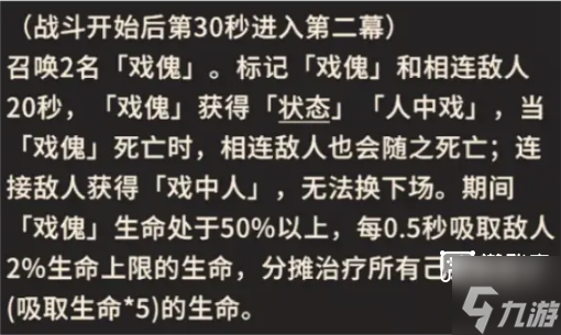 30秒后进入第二幕,梁曲将标记召唤的「戏傀」与其所连线的侠客单位,「戏傀」获得「人中戏]状态,当「戏傀」死亡时,相连单位也会随之死亡;侠客单位获得「戏中人」状态,无法下场,期间戏傀将吸取该单位的生命,同样需及时清除。