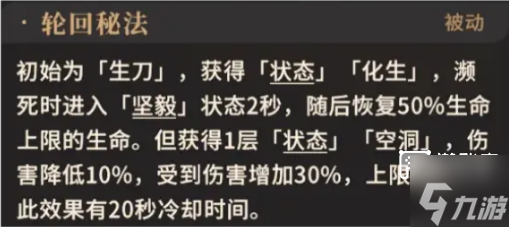 谭秋分为「生刀]和「死刀]阶段,「生刀]期间,谭秋拥有状态「化生],在濒死时会回血复活,复活后拥有可叠加的状态「空洞],谭秋的伤害降低,且受到伤害增加。