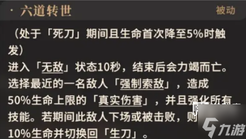 在「死刀」阶段的最后,触发「六道转世],谭秋会进入10秒无敌状态,强制索敌最近的侠客,可使用无敌、化劫等手段保证被标记侠客的生存,若侠客被击败,将再次进入「生刀」阶段。