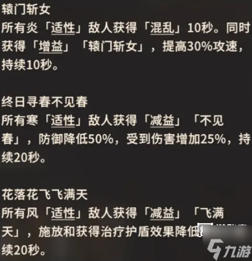 另外,梁曲的技能「戏中演绎」会导致炎属性侠客「混乱J,寒属性侠客防御降低,风属性侠客释放和获得治疗护盾的效果降低。因此,阁主在搭配阵容时需酌情考虑,例如若使用炎属性侠客(如南照霜)作为主要输出,就需要准备相应对策来解决混乱状态。