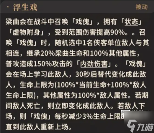 梁曲在战斗会中召唤「戏傀],拥有状态「虚物附身J,受到的范围伤害将大幅提高,此时可选择群攻侠客降低输出难度。同时,每当召唤「戏傀],会随机选中1名侠客单位与其相连并学习,在30秒后替代该侠客单位。在此期间若被连线的侠客单位被击败,则立刻变化为该单位。