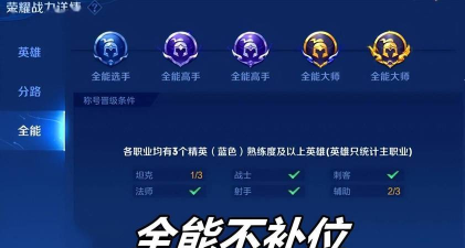 速览 本文详细介绍了《王者荣耀》中全能高手的获得条件,分为初级和高级两个等级。初级全能高手要求所有分路达到5段,三个分路达到10段,分路总和达到50段;高级全能高手要求所有分路达到10段,三个分路达到20段,分路总和达到100段。通过排位想玩界面可以具体条件,帮助玩家明确目标。