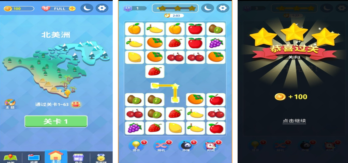 主打消除机制多元化,除常规三消外,同步支持四消、五消及L形/T形等非线性消除判定。不同消除规模触发差异化反馈:三消为基础得分单元,四消生成方向性特效砖,五消激活全场随机重排,L/T形则释放区域性清屏效果。该机制迫使玩家在单局中频繁切换策略重心——既需保障基础连击维持节奏,又须预留空间构建高阶消除结构。UI界面采用低饱和度配色方案与无衬线字体组合,减少视觉疲劳,适配长时间连续操作场景。关卡评价体系采用三星制,依据步数利用率、目标完成度、连锁效率三项指标综合评分,激励用户反复尝试优化操作路径。道具系统包含延时器、万能砖、步数补充包等十余种功能组件,配合随机掉落与成就解锁双通道获取方式,保持探索驱动力。