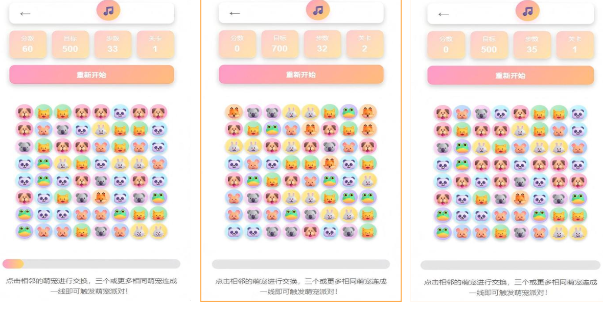在标准三消框架之上融合宠物图鉴收集与主动技能养成体系。每次成功匹配元素后,系统按概率发放不同稀有度的萌宠卡片,每只宠物拥有独立技能效果,如范围清除、步数延长或障碍软化等,可在指定关卡中手动激活。随着章节推进,任务目标日趋复合化——需同时达成收集数量、限时通关、特定障碍清除等多项条件。场景主题覆盖花园、房间、森林三大视觉单元,各单元对应独立动画逻辑与关卡序列排布,强化沉浸式视觉反馈。通关奖励包含通用货币与专属道具,用于宠物升星、技能强化及新图鉴解锁。