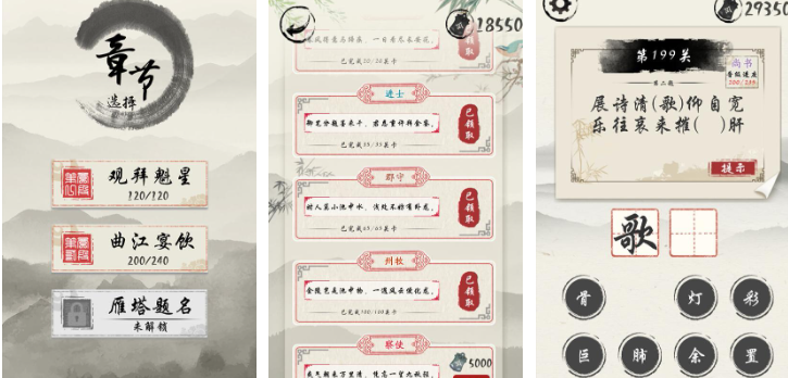 覆盖唐宋至明清主流诗词流派,收录超千首课标指定篇目及拓展经典。解谜形式包括“残句补全”“意象归类”“格律校验”“诗人关系图谱推理”等多元类型。背景音乐采用传统五声音阶编曲,场景设计参照《营造法式》与《长物志》美学原则,实现诗、画、乐三重意境统一。特别设置“创作实验室”模块,支持用户基于限定词牌与韵部尝试微创作,强化输出能力训练。