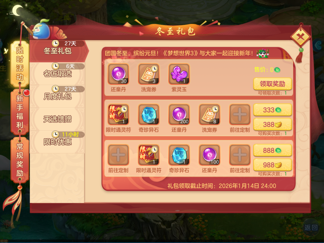 12月18日维护后至1月15日24:00,所在服务器等级≥45的少侠可前往奖励界面领取冬至礼包。