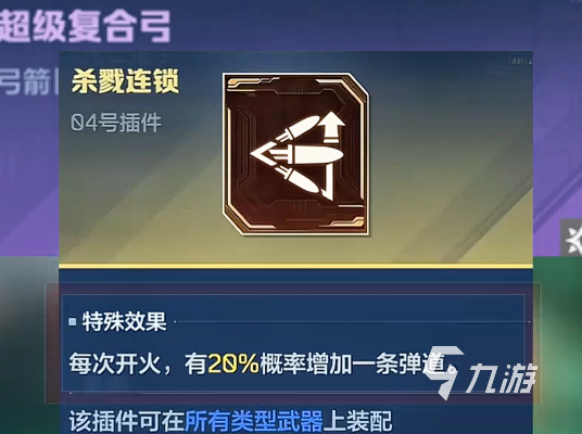 第四枚芯片建议选用【杀戮连锁】。该效果赋予一定概率额外生成一枚同类型箭矢并沿相似弹道飞行。虽触发率并非100%,但在实际战斗中,结合复合弓本体较高的单发命中率与中远距离稳定性,该效果可有效扩大火力覆盖密度,并与前述芯片产生协同效应——例如连锁箭同样可触发协频共振层数、多重伤害充能及元素伤害叠加,进一步放大整体输出潜力。
