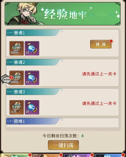 分为经验地牢、金币地牢、结晶地牢和徽章地牢,是基础养成资源的主要来源,每次挑战成功便能开启扫荡,每种地牢每天都能扫荡6次,前三次免费,后三次需花费钻石,挑战不消耗扫荡次数。