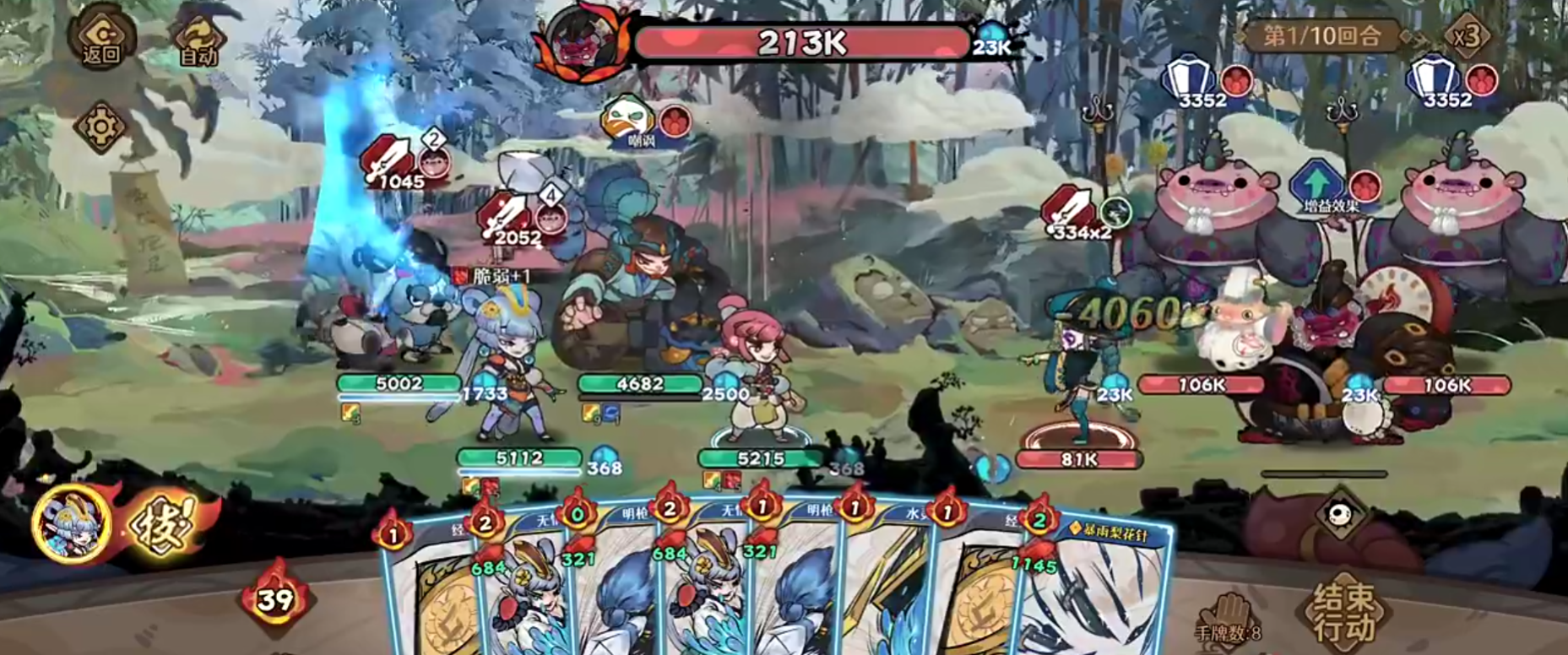 正式开启战斗之际,可以对角色技能进行调整,像是水木灵儿的使得气血最少的己方回复200%气血的技能,就要立刻释放,而南宫无情的发现一张无形飞刀、对敌人打出手牌中的5张飞刀,就要在武学放出结束后使用来最大化伤害。