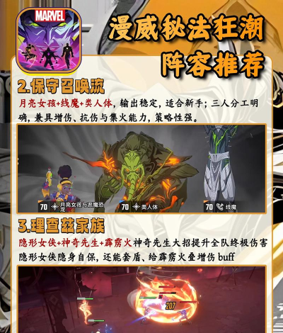 漫威秘法狂潮防御阵容就给大家分享到这里,要组好防御队,要先从坦克角色下手,选一个或两个强力防御者来承担火力,然后补充控制/辅助保证续航与队伍稳定,最后选一个输出能配合前两者的角色,不求瞬间爆发,但求持续,能拖住、消耗并稳定推进。装备与资源分配上优先提升坦克、防守技能、盾与生命属性;然后是辅助的治疗、减伤与控场能力;最后是输出角色的持续伤害与清怪能力。