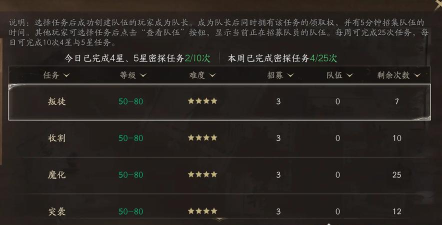 既然玩家已经发现他作为组队任务,通常是对等级有对应的要求,简单来说就是玩家达到了对应的等级之后,才能够领取对应的密探。任务当玩家组队成功之后,其实他们所涉及到的区域不同。对组队人数往往会有不同的要求,举个简单的例子,在中原、江南等等地区的任务,他们至少需要两个人去组队。而在雁秋,幽州等等地区的任务,至少需要三个人组队。