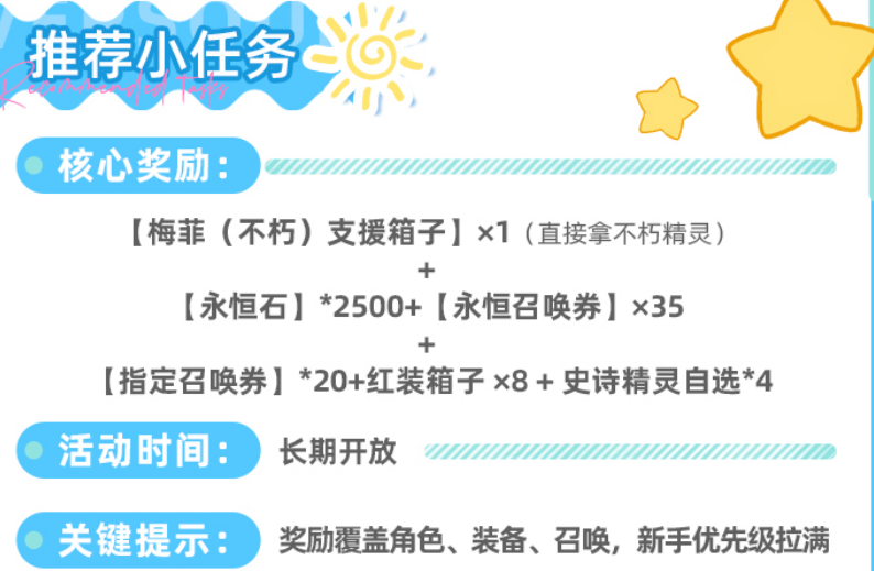 “推荐小任务”为长期常驻系统,覆盖新手全流程引导节点。全部任务完成后共可获得2500颗永恒石,同时附赠35张永恒召唤券、20张指定召唤券、8个红色装备宝箱及4个史诗精灵自选权。任务内容以基础功能解锁为主,如通关普通副本3次、将2名角色提升至30级、开启公会界面等,基本与新手教学节奏同步,自然推进即可达成。入口位于主界面右侧功能栏,支持随时查看进度与剩余目标。