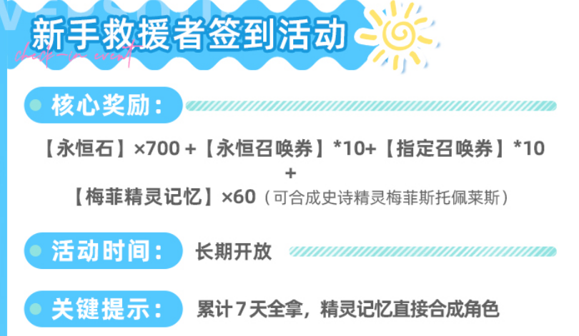 签到类活动共设两项:其一为“新手救援者签到”,持续7天,满勤奖励含700颗永恒石、10张永恒召唤券及10张指定召唤券;其二为“上线纪念签到”,周期为14天,总计发放2400颗永恒石与20张指定召唤券。两项叠加后共获3100颗永恒石,折合约10张永恒召唤券价值,属于低操作成本、高确定性回报的日常收益。