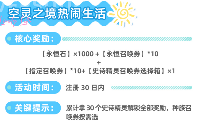 “空灵之境热闹生活”活动限时开放于注册后30日内。玩家累计收集30个史诗品质精灵即可激活全部奖励,包含1000颗永恒石、10张永恒召唤券、10张指定召唤券及1个史诗精灵召唤券选择箱。该目标在常规推图与日常召唤节奏下可自然达成,无需额外刷取,属于兼顾成长性与资源回报的综合型活动。