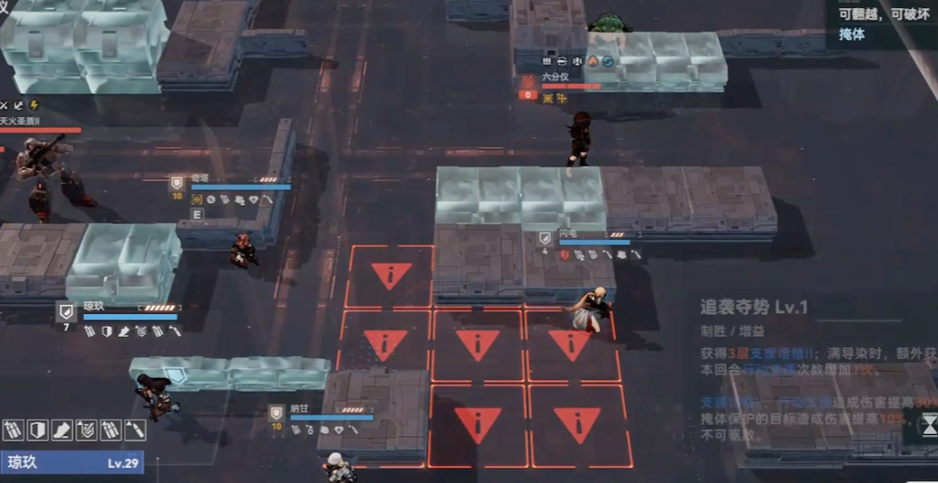 地图中存在大量掩体,掩体提供的减伤率在百分之二十到百分之三十五之间,掩体跟稳态都能提供高额减伤效果,稳态是角色血条左边的护盾标志,每个角色和敌人都存在弱点,使用弱点攻击命中敌人能带来百分之十的伤害提升和额外两点稳态伤害。在选中目标后能直观看到当前的减伤率,敌我双方角色只要躲在掩体附近就能降低来自特定方位攻击造成的伤害。