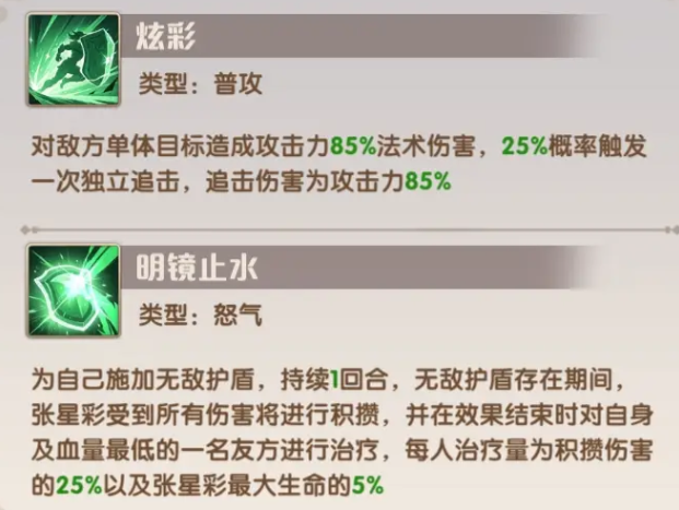 前排核心推荐张星彩,是萌新过渡期的关键生存保障。其怒气技“明镜止水”可施加一回合无敌护盾,期间所受全部伤害将被储存;护盾结束后,按储存伤害的25%恢复自身生命,并额外恢复相当于自身最大生命值5%的血量。该技能兼具承伤、反哺与团队续航能力,大幅提高阵容容错率。同时务必激活诸葛亮与黄月英的羁绊——双人同阵可提升全体12%攻击力;黄月英普攻对肉盾类目标伤害额外提升50%,强化对高防御敌人的压制力。