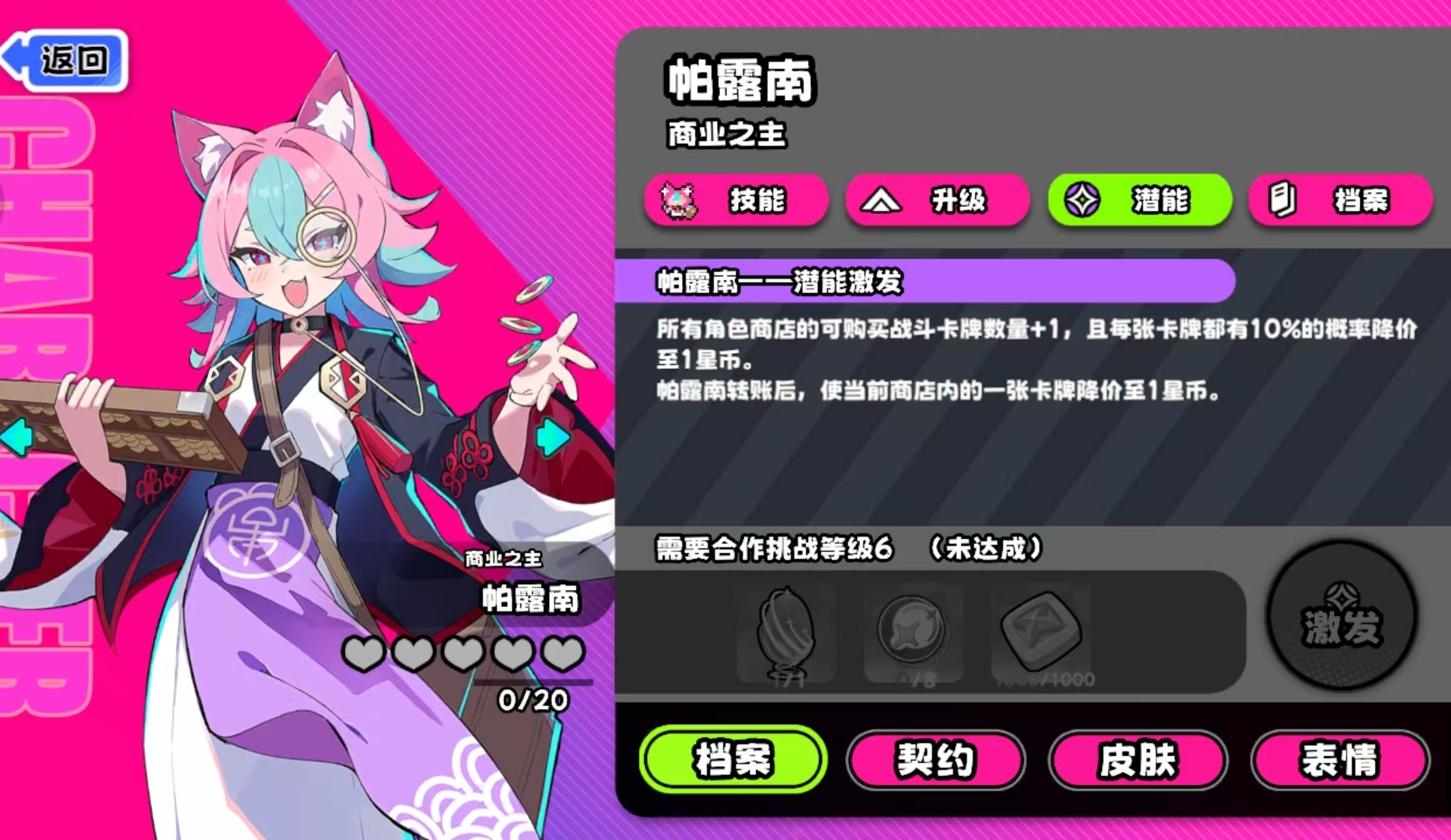 当帕露南完成潜能激发后,其商店协同能力进一步跃升:除战斗牌购买上限再+1外,所有可购卡牌均触发概率性降价机制,最低可降至1星币。极端情况下,整页商店商品可能全部标价为1星币,极大压缩获取优质手牌的成本。在合作模式下,若她向队友发起转账操作,当前所处商店将立即刷新一张售价为1星币的手牌——这意味着“先转账、再购卡”的操作链可实现收益最大化。